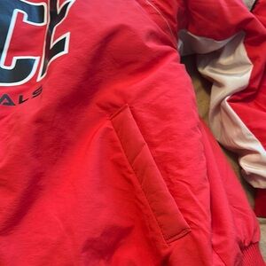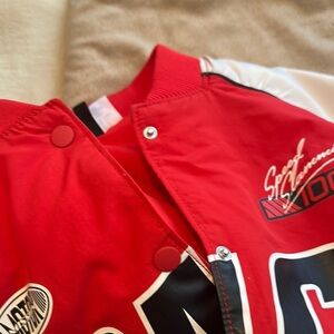 Stand out with this vibrant red racing jacket, perfect for motorsport enthusiasts. Featuring bold graphics and a comfortable fit, it's a must-have for any racing fan. Like new