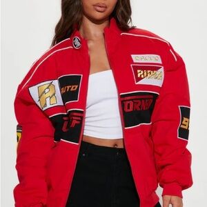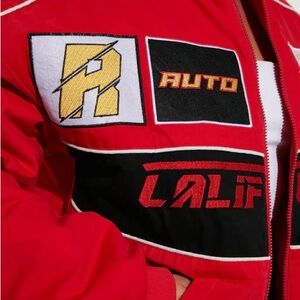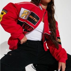 Stylish red racing jacket featuring bold patches. Perfect for a sporty look.