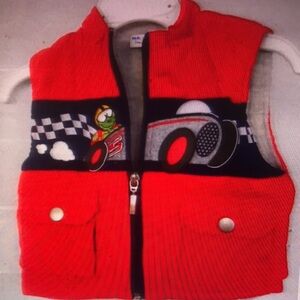 Vibrant red vest with a fun racing theme. Features a playful car and checkered flag design.