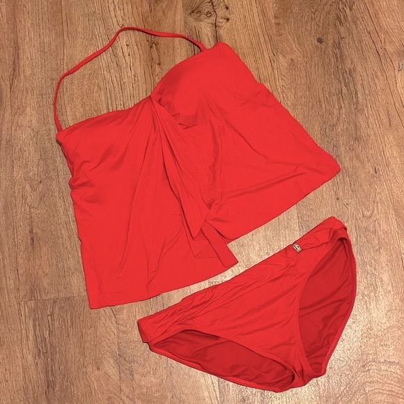 Bright Red Ralph Lauren tankini swimsuit. Lightly lined top with flowing bottom. Super sexy! Great suit to tan in!! Only worn once