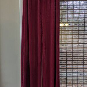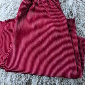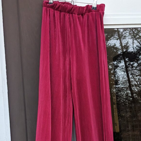 Red Raspberry Ribbed Straight Leg Pants. Never worn. No imperfections. These are a soft and a flowy material. Could be dressed up with some cute shoes and top for a night out or dressed down for lounge wear. Waist measures 12 in and stretches to 16 in