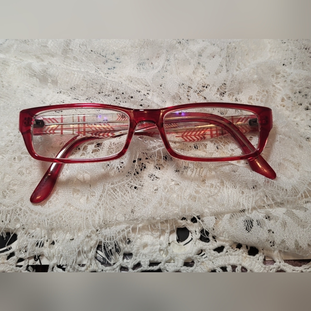 Stylish red rectangular glasses with a plaid interior design.