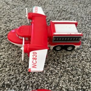 Engage in thrilling rescue missions with this vibrant red vehicle play set. Includes a fire truck, helicopter, and airplane for endless imaginative adventures.