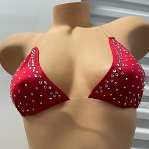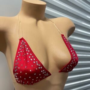 Dazzling red bikini set with sparkling rhinestones. Perfect for a bold beach look.