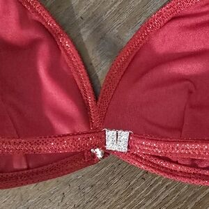 Dazzling red bikini set adorned with rhinestones. The top is a C molded cup. Bottoms are pro cut and can be Altered. Waist is about 25 inches. Budget friendly, perfect for a first time competitor.