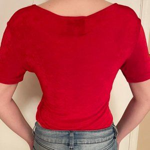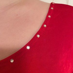 Vintage 90s Red Bodysuit with snap closure in the crotch. Sparkly silver rhinestones around the scoop neckline.
