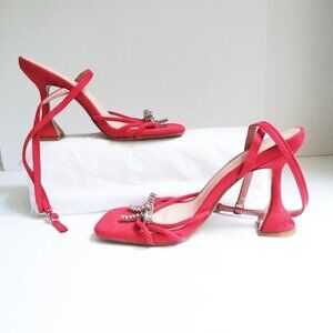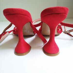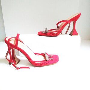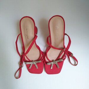 * Red Suedette Sandals Square Toe Rhinestone Bows Double Wrap Around Ankle Strap Red Square Toes Wrap Around Strappy Sandals Horsehoof Heel Sz 38 / 7.5 NWOT