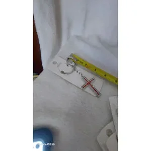 Red Rhinestone cross pendant. The cross is embellished with numerous small, red rhinestones on its front surface. It is attached to a silver-toned split key ring via a short chain.