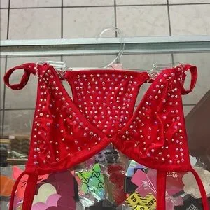 Stunning red top adorned with sparkling rhinestones. Perfect for a night life .. strippers .. exotic entertainers .. club