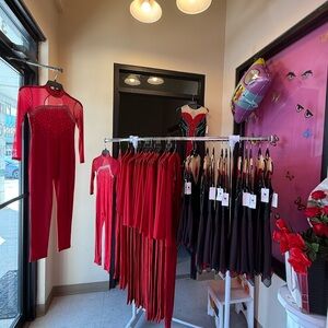 Elegant red jumpsuit with rhinestone embellishments. Perfect for performances or special occasions.