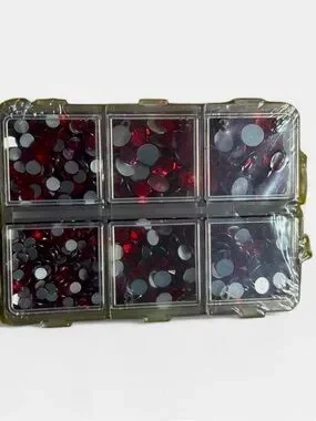 Compact clear plastic organizer featuring six individually hinged, numbered compartments filled with vibrant red flat-back rhinestones in graduated sizes (approx. SS6 to SS20+), designed for precision work and clean organization. Each stone has a faceted surface for strong light reflection and a silver foil backing with flat, non-hotfix bases, making them ideal for nail art, garment embellishment, resin work, and detailed crafts. Case measures approx. 3.25” x 2.1”, travel-friendly and secure for on-the-go use or studio setups. Condition is clean and well-kept with all compartments intact and stones sorted.