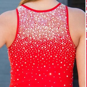 Stunning red tank top adorned with sparkling rhinestones. Perfect for adding a touch of glamour.