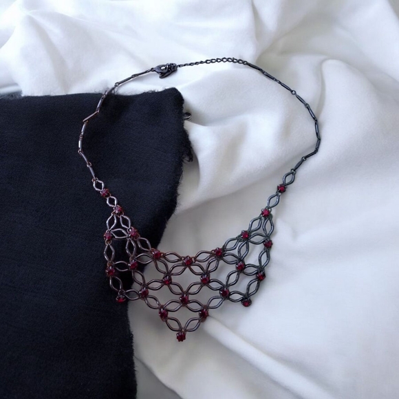 Red rhinestone festoon bib necklace with a gunmetal gray chain. Reminiscent of the Victorian era. This dark choker has only been used once and has otherwise been well taken care of. Elegant and mysterious accent for those who prefer darker looks.