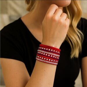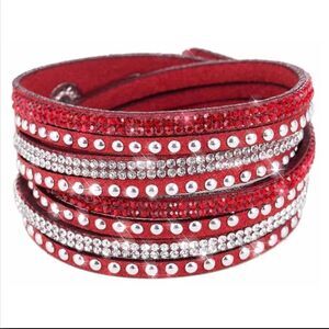 Beautiful Red Rhinestone bracelet punctuated with a medley of glittering Swarovski elements just in time for the holidays or chic office wear. Sleek micro-fiber bracelets wrap and snap to 3 different sizes.