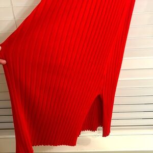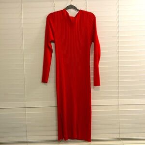 Very stretchy long sleeve red knit midi body-con dress. Flattering slit to left side of dress. V-neck. Never worn. Tag still attached.