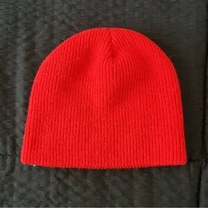 Lightweight red ribbed beanie. Soft knit fabric provides comfortable warmth and stretch. Sleek, minimal design pairs easily with casual and outdoor looks.