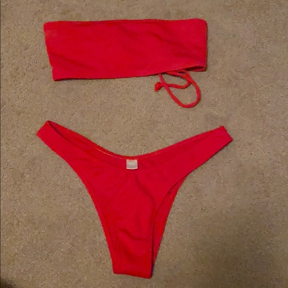Strapless top with adjustable back. High leg and cheeky bottoms. Size large but fits more like a medium. I’m a size 32D and wear a 26 in jeans/shorts. Work a handful of times and in good condition.