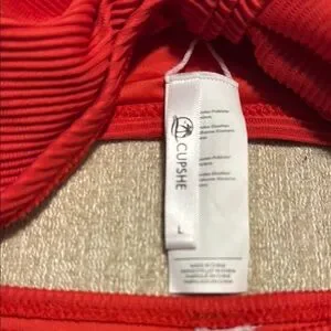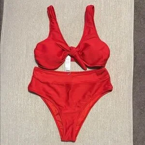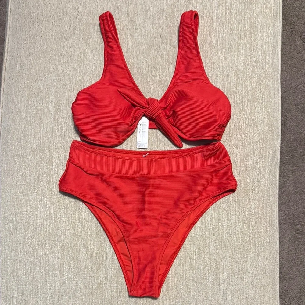 Stylish red ribbed bikini set. Features a knotted top and high-waisted bottoms. Bottoms don’t have a tag. Worn for a photo shoot. Perfect for the beach or pool.