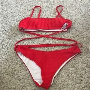 Stylish red ribbed bikini set with criss-cross straps. Perfect for the beach or pool.