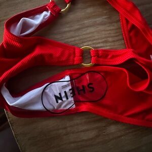 Bold red bikini with stylish gold ring accents. Perfect for beach days.