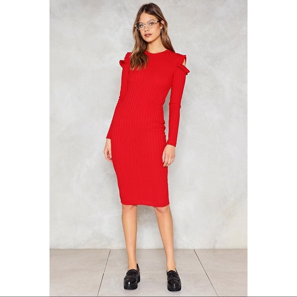 Red Ribbed Bodycon Cold Shoulder Ruffle Dress