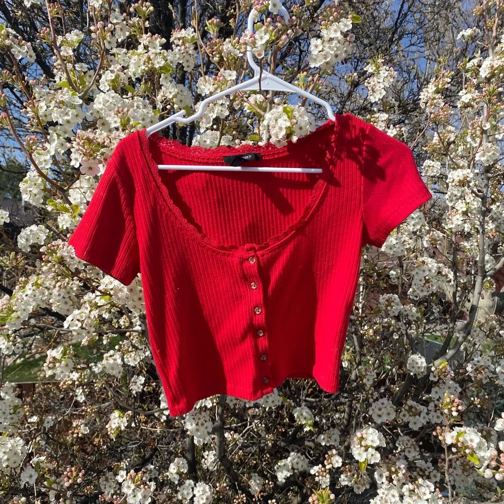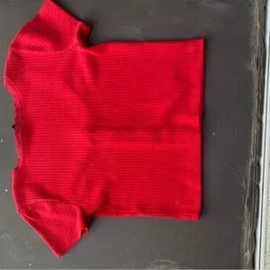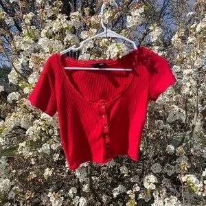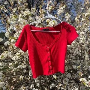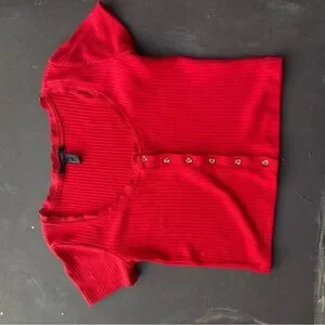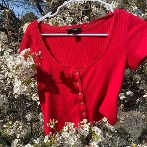 Red Ribbed Button-Up Blouse