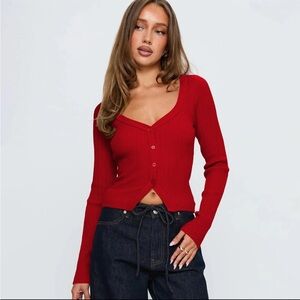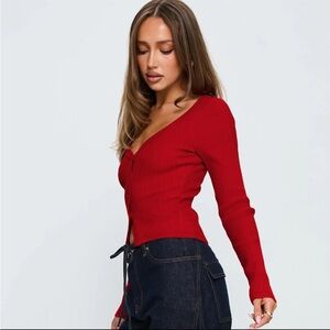Stylish red ribbed cardigan with button-up front. Perfect for layering.