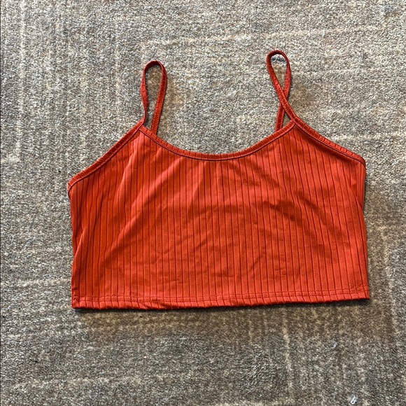 Stylish red ribbed crop top. Features thin straps. Perfect for casual wear.