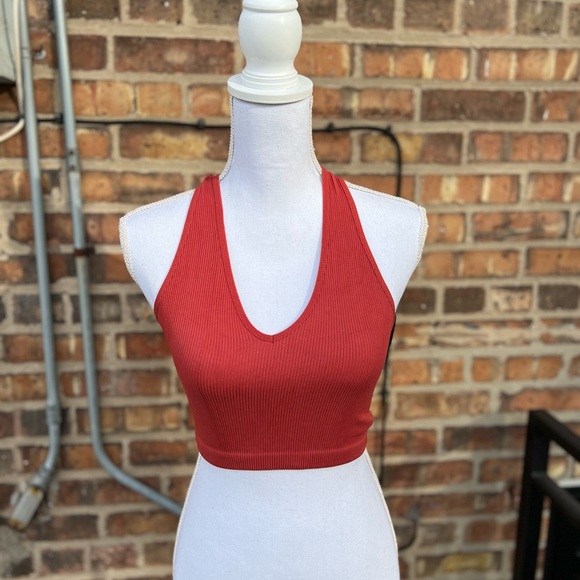 Stylish red ribbed crop top with a deep neckline. Perfect for casual outings.