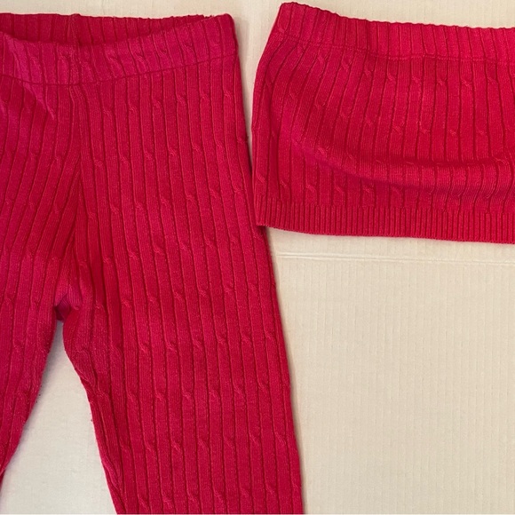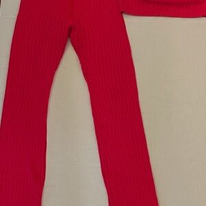 Stylish pink ribbed knit set. Includes top and pants. Perfect for a chic look.