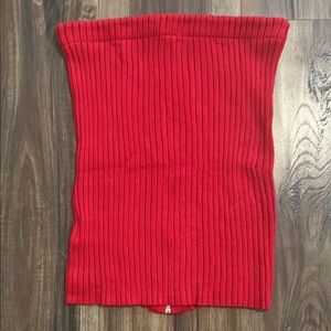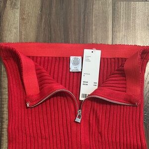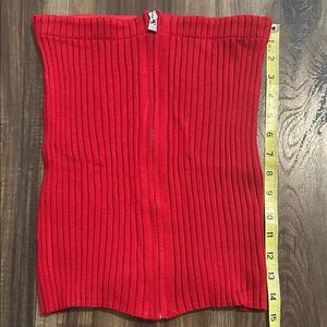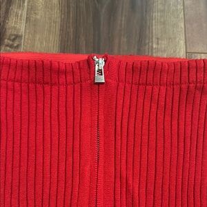 Stylish red ribbed mini skirt or tube top with a front zipper. Perfect for a chic look. Pair with white tee and denim jacket for an all-American look!