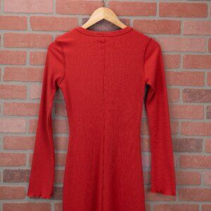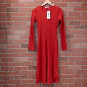 Gorgeous red midi dress with bell sleeves and a very stretchy comfortable ribbed fabric. Perfect for the holidays! Brand new with tags, but does have a couple of minor issues (see photos and video). A small defect in the thread on the back and puckering where the label was sewn in. Priced accordingly! Still a gorgeous dress!