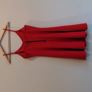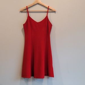 Skater dress with adjustable straps in good condition. The dress comes in at the waist and has princess seams down the front for a slimming effect. It has a zipper and a hook closure at the back. The hanging straps have been removed and there is some slight pilling.