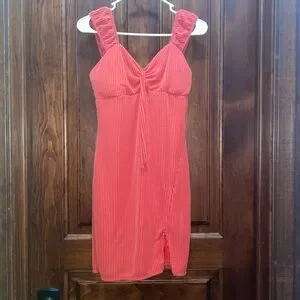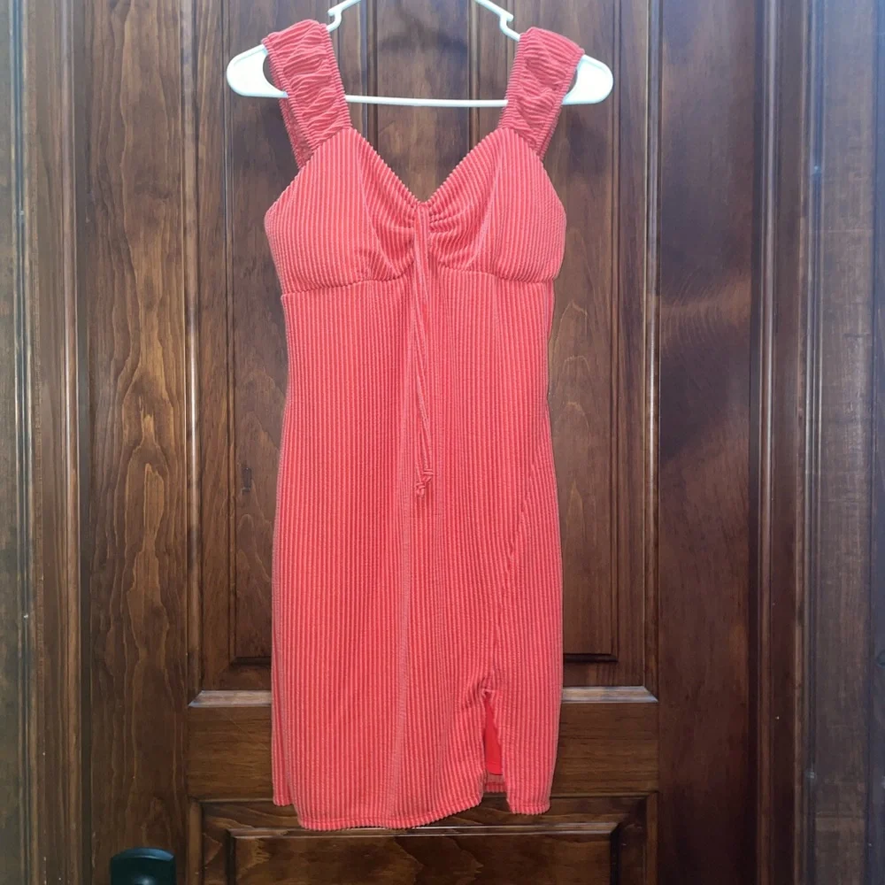 Ribbed Red Mini Dress with small Slit. White stitching. Short stretch fabric, BodyCon tight. Size Medium 4-6.