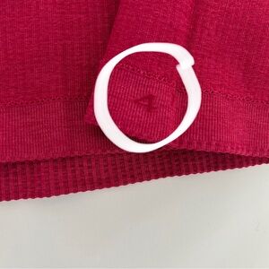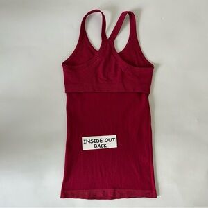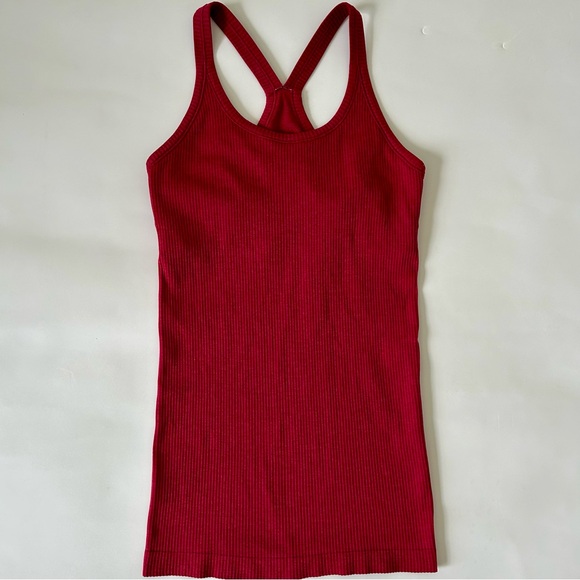 Elevate your wardrobe with this stylish Lululemon red ribbed tank top. Perfect for layering or wearing on its own, this top offers both comfort and style. Built in shelf bra. Padded cups can be inserted.