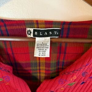 Soft red ribbed button-front top with colorful embroidered swirls / spirals accents at the neckline and sleeves. Very whimsical 90s