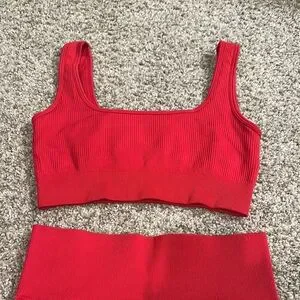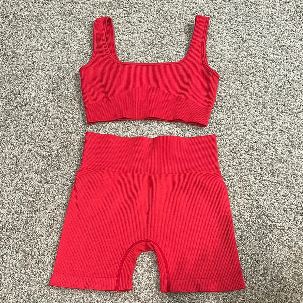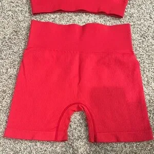 Stylish red ribbed two-piece set. Includes a crop top and high-waisted shorts.