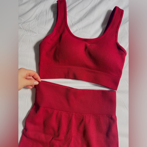 Stylish red ribbed two-piece set. Includes a crop top and high-waisted bottoms. Perfect for casual wear.
