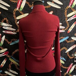 Stylish red ribbed sweater with a rhinestone zip-up front. Perfect for layering. Can also fit S/M