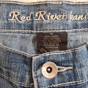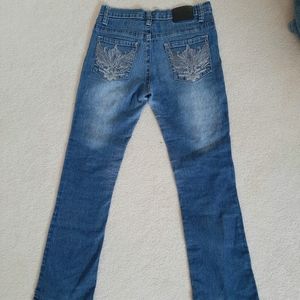 Cute, barely worn with stretch fit. Gorgeous silver embroidery on back pockets. Fits a size 2 to 4 in women's, or size 16 in girls. Inseam 30", low rise waist 32".