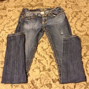 Red Rivet Jeans with distressed look in EUC. SIZE 3 skinny jeans. Size seems to run small.