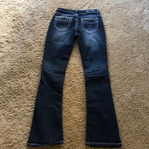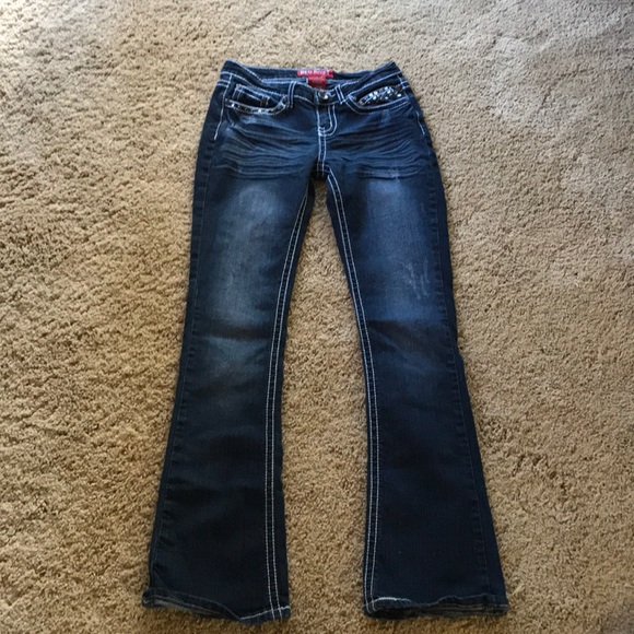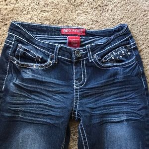 Red Rivet jeans in size 3. Inseam 31. These have Rhinestone rivets all over front and back pockets. They are absolutely adorable.