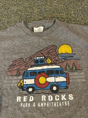 Soft gray T-shirt featuring a colorful van graphic and Red Rocks Park & Amphitheatre text. Youth size L would fit a women’s XS or S
