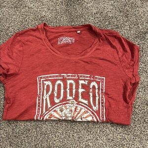 Embrace a bold look with the Rodeo Graphic Tee. Perfect for casual outings, this top features a striking rodeo design. Burnt Rust Color