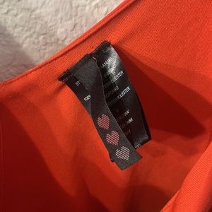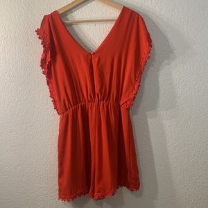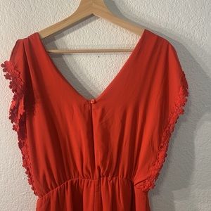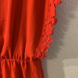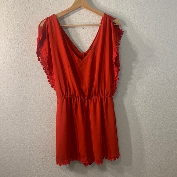 Red short sleeve romper with split flounce sleeves, beautiful red floral lace trip and v neck in front and back, button closure back and tapered in at the waist. Size S. Material is 100% polyester, worn only once! Beautiful for wine tasting, engagement pictures, going out, work, you name it! *PERFECT FOR A TAYLOR SWIFT CONCERT*