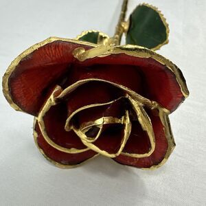 A timeless symbol of love and beauty, this 24K gold-plated rose is a stunning decorative piece. The deep red petals are delicately edged in gold, creating a luxurious and eye-catching effect. The stem and leaves are also plated in gold, adding to the overall elegance of the design. This rose is a perfect gift for Valentine's Day, anniversaries, birthdays, or any special occasion. It would also make a beautiful addition to any home decor, adding a touch of sophistication and romance to any room.