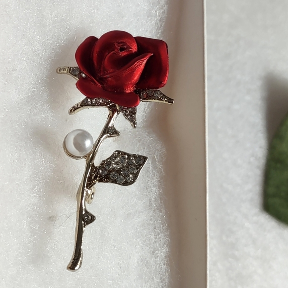 Beautiful long stem goldtone rose with a pearl accent and crystals.