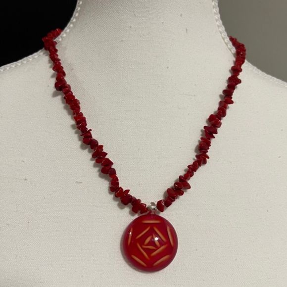Red Rose Coral Bead Lucite Round Pendant Toggle Clasp 22 Inch Necklace