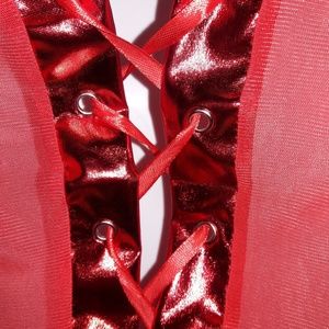 The fabric is stretchy Beautiful delicate rose lace and mesh. There is a tie at the back of the neck and lace up in the back. One piece. One Size Fits Most XS through Large. Hand wash only! Lay flat to dry.