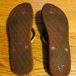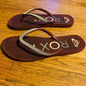 Red with silver accent ROXY flip flops. Gently used, in great condition with a lot of life left to live. Love these flip flops and the spring in my step when wearing. Sadly, I haven’t worn them at all this summer, so I’m setting them free to find a new home.